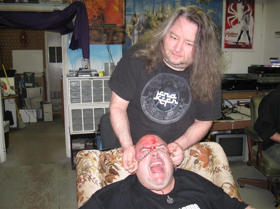 Unfortunately, things took a turn for the worse when I was once again thrown under the bus for smoking. Now, I've actually been pretty good about keeping the habit under control, but as I've said before, I tend to crave tobacco strongly when I'm in social settings. Don't know why this is, really, but in the interest of not being a mooch, I will usually purchase a pack to float me by, especially when I know there are a number of shows coming up in a short period. And, I get the fact that the guys are really just looking out for my well-being, I really do! But, come on... I mean, I've heard of tough love, but these guys take it to a whole new level, as was already proven when Joe clotheslined me through a table last November. (Yes, the video is on our website...) This time was perhaps a bit less brutal... or not... hard to say. It certainly wasn't pleasant. First off, Azkath bloodied me up with a rusty chain, and I would have said that was punishment aplenty... but, these guys LOVE to go to extremes, so in the interest of "cleaning the wound", he liberally poured peroxide into the wound... and followed it up with rubbing alcohol... and, because that must not have seemed like it was good enough, he poured on some lighter fluid next. He then struck a match, and turned me into Ghost Rider for about 30 seconds...